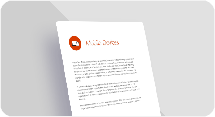 Mobile Devices Regardless of size, businesses today are becoming increasingly mobile, with employees traveling more often to meet clients; to work with teams from other offices; or to connect with workers in the field, in different retail locations and more. Studies also show that nearly half of growing 1 companies’ owners now routinely use smartphones to run day-to-day operations. As a result, these companies’ IT professionals are looking for better ways to support mobile employees and provide better access and security from a growing range of devices—and cloud is a gr eat way to do this. IT professionals in our survey said 95% of their organisations support laptops, while 88% support smartphones and 78% support tablets. Based on their feedback, the average small or mid- sized business supports 29 laptops, 38 smartphones and 14 tablets on its network, although organisations in EMEA support considerably more laptops and smartphones than those in North America. Smartphones emerged as the most commonly supported BYOD device across geographies. No single mobile OS platform dominated in the survey; most organisations see a pretty even mix. We were reaching a tipping point with over half of our system users being mobile users. All roads lead to mobile first, and we needed to support it through the cloud. 4 Respondent, Forrester survey The Small Business Cloud Outlook - Mobile Devices 11